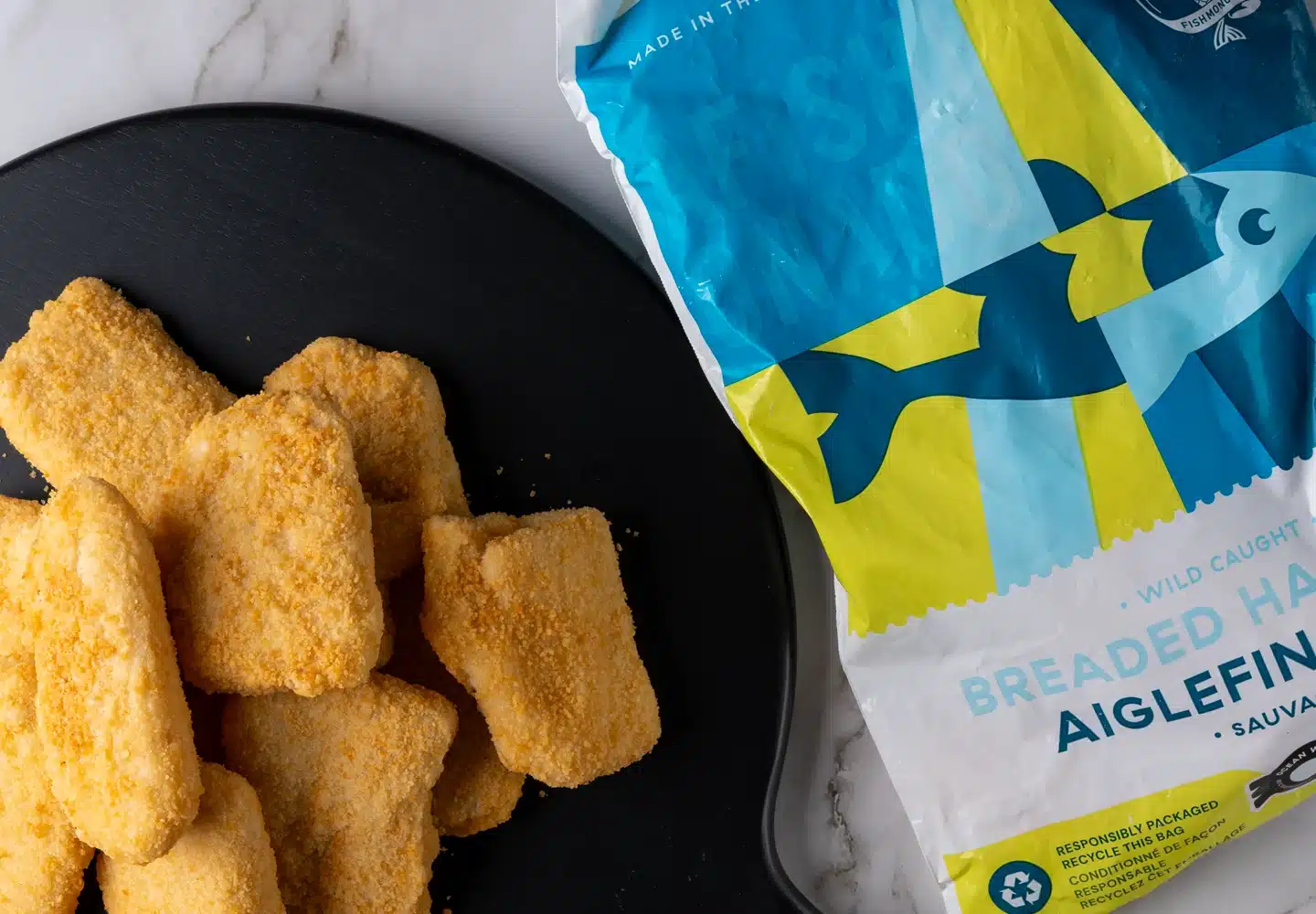 Ingredients: Atlantic haddock, Toasted wheat crumbs with spices, Water, Soybean oil, Modified corn starch, Wheat flour, Salt, Wheat gluten, Garlic powder, Sugar, Dried egg white, Vegetable oil (canola and/or sunflower), Onion powder, Baking powder, Pea protein isolate, Methylcellulose, Natural flavour, Yellow corn flour, Guar gum.